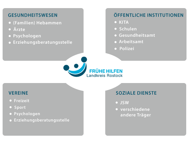 Durch die Bundesinitiative Frühe Hilfen und durch die Unterstützung des Jugendamtes des Landkreises Rostock sind in den letzten 2,5 Jahren regionale Arbeitskreise entstanden – unser Bereich ist der nordöstliche Bereich des Landkreises. Hier sind verbindliche Strukturen in der Zusammenarbeit entstanden. In Anbetracht der komplexen Anforderungen an Frühe Hilfen werden geregelte, gut koordinierte und konstruktive Zusammenarbeit der unterschiedlichen Professionen und Institutionen benötigt.
